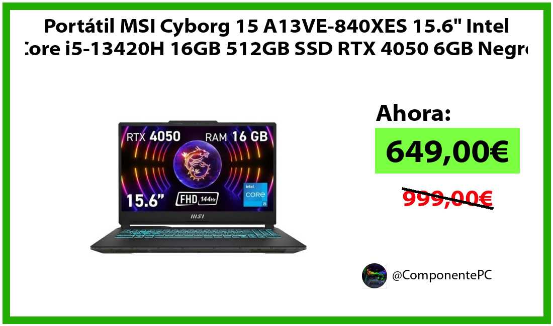 🔹Portátil MSI Cyborg 15 A13VE-840XES 15.6" Intel Core i5-13420H 16GB 512GB SSD RTX 4050 6GB Negro solo 649,00€❗️⚡️