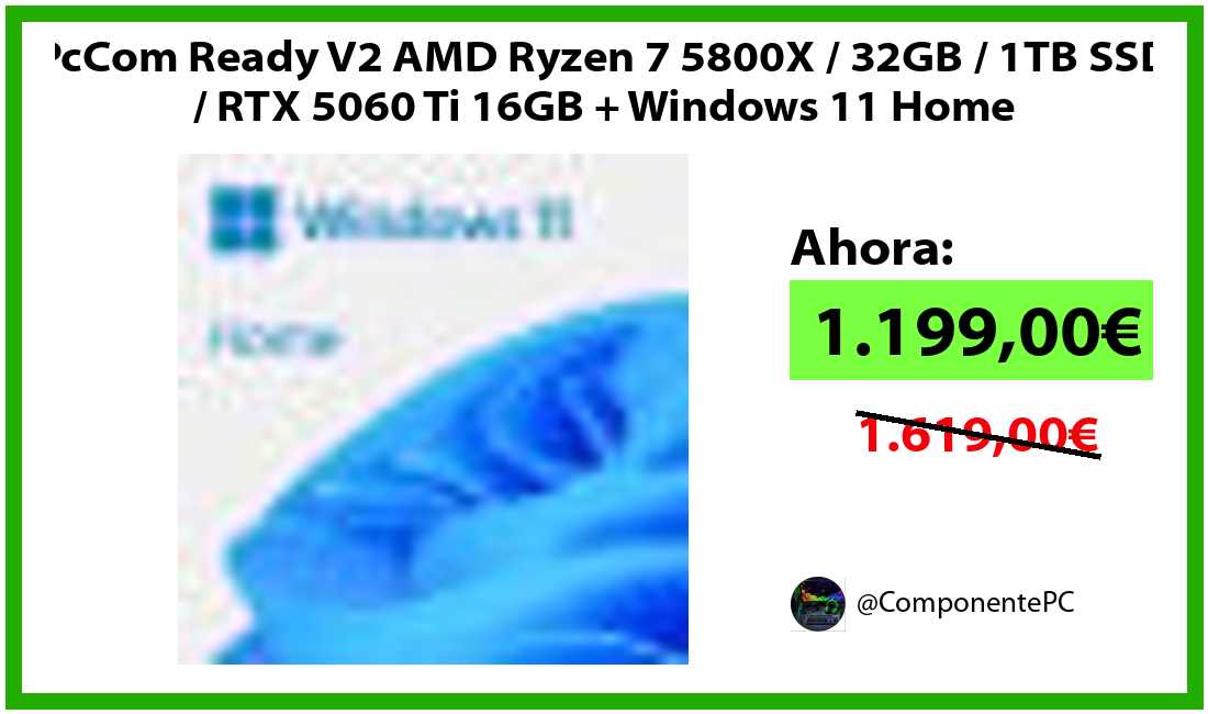 🔹PcCom Ready V2 AMD Ryzen 7 5800X / 32GB / 1TB SSD / RTX 5060 Ti 16GB + Windows 11 Home solo 1.199,00€❗️⚡️(PVP: 1.619,00€)