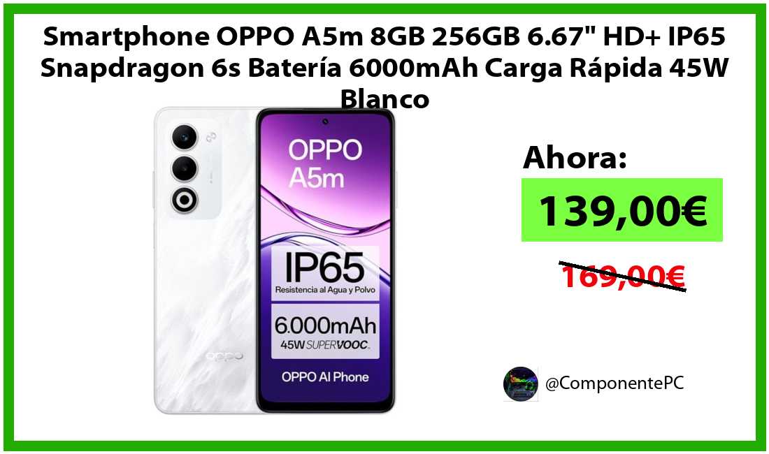 🔹Smartphone OPPO A5m 8GB 256GB 6.67" HD+ IP65 Snapdragon 6s Batería 6000mAh Carga Rápida 45W Blanco solo 139,00€❗️⚡️