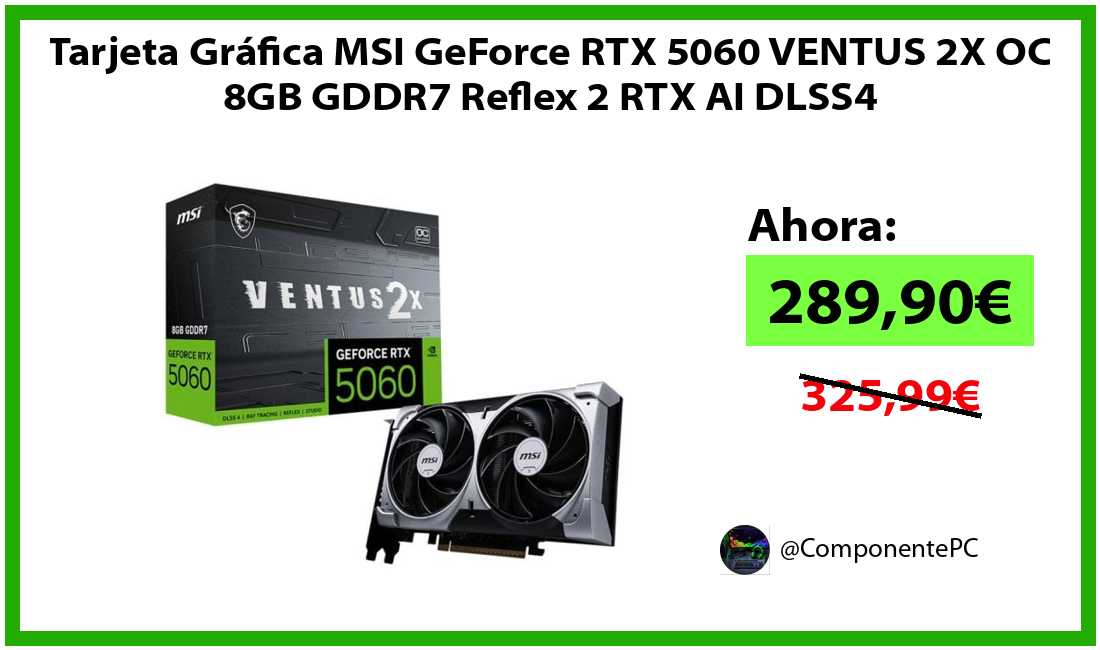 🔹Tarjeta Gráfica MSI GeForce RTX 5060 VENTUS 2X OC 8GB GDDR7 Reflex 2 RTX AI DLSS4 solo 289,90€❗️⚡️(PVP: 325,99€)