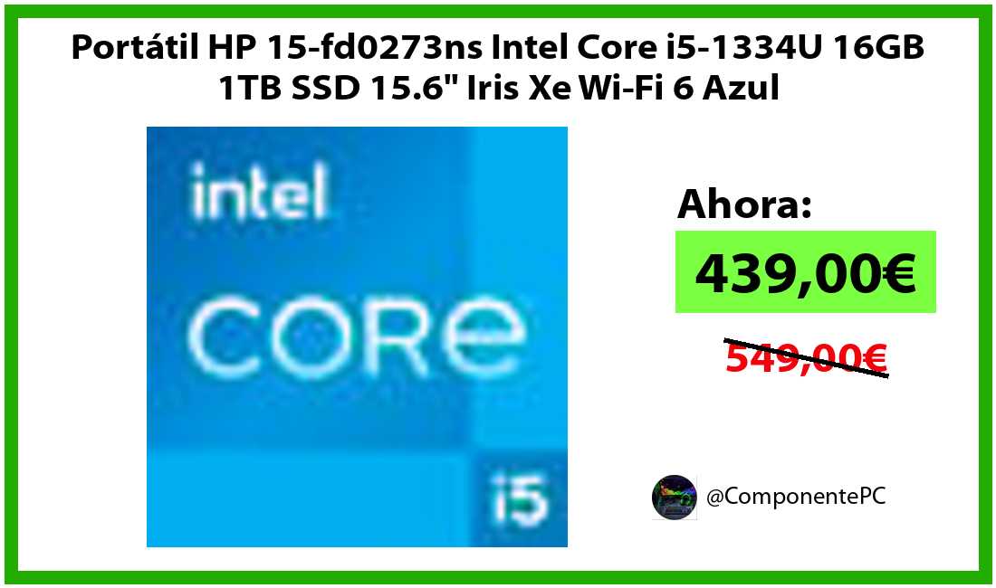 🔹Portátil HP 15-fd0273ns Intel Core i5-1334U 16GB 1TB SSD 15.6" Iris Xe Wi-Fi 6 Azul solo 439,00€❗️⚡️