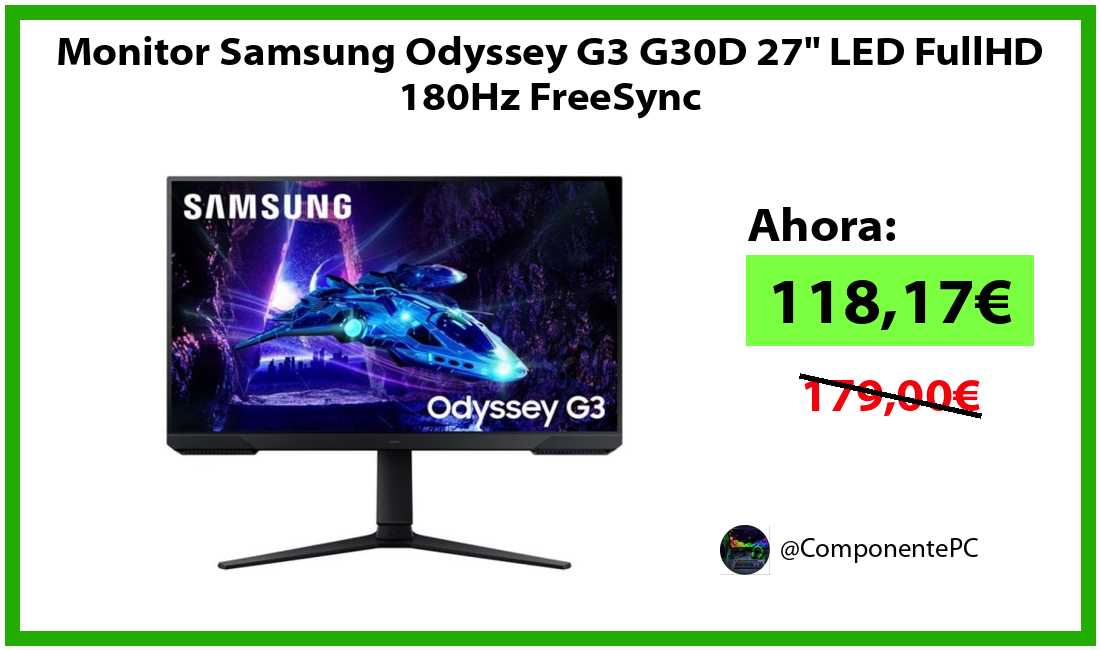🔹Monitor Samsung Odyssey G3 G30D 27" LED FullHD 180Hz FreeSync solo 118,17€❗️⚡️(PVP: 179,00€)