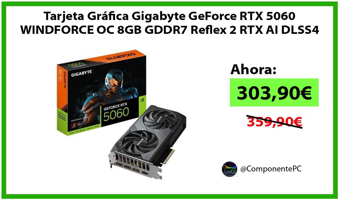 🔹Tarjeta Gráfica Gigabyte GeForce RTX 5060 WINDFORCE OC 8GB GDDR7 Reflex 2 RTX AI DLSS4 solo 303,90€❗️⚡️(PVP: 359,90€)