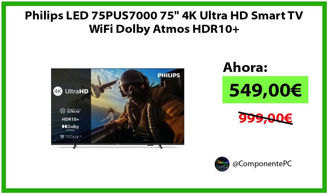 🔹Philips LED 75PUS7000 75" 4K Ultra HD Smart TV WiFi Dolby Atmos HDR10+ solo 549,00€❗️⚡️(PVP: 999,00€)