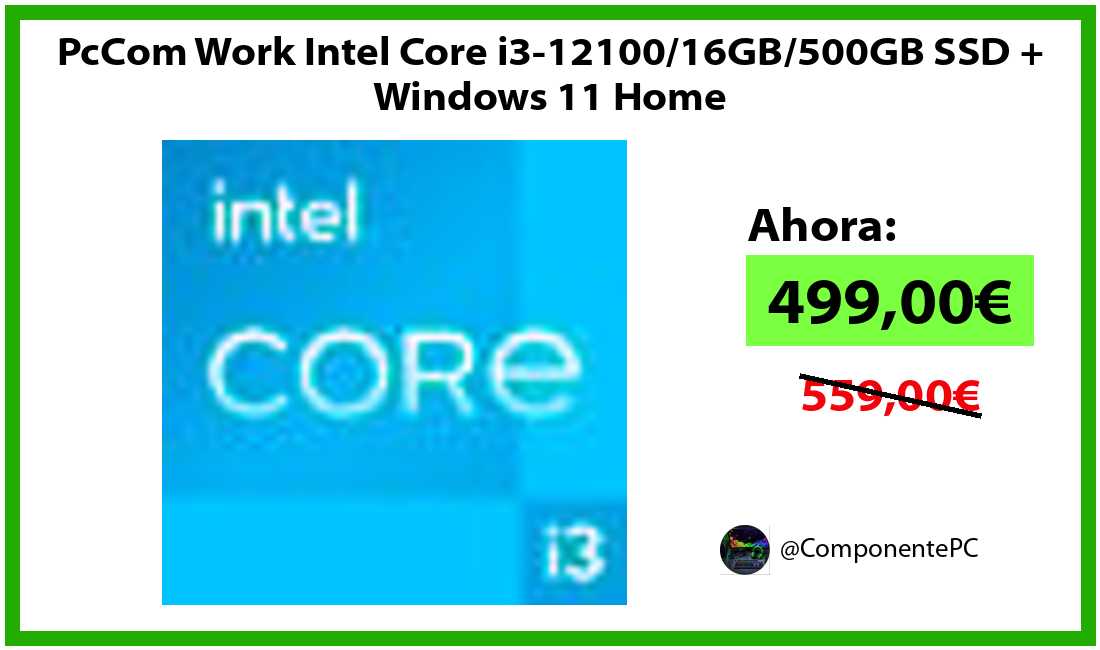 πΉPcCom Work Intel Core i3-12100/16GB/500GB SSD + Windows 11 Home solo 499,00β¬βοΈβ‘οΈ(PVP: 559,00β¬)