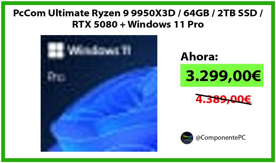 πΉPcCom Ultimate Ryzen 9 9950X3D / 64GB / 2TB SSD / RTX 5080 + Windows 11 Pro solo 3.299,00β¬βοΈβ‘οΈ