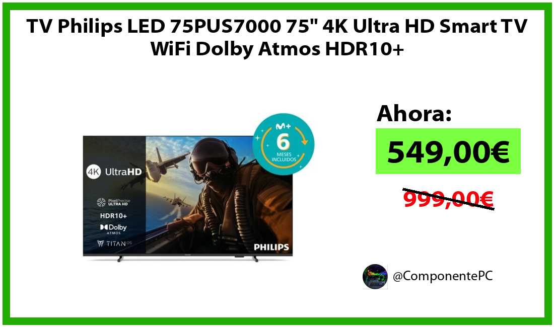 🔹TV Philips LED 75PUS7000 75" 4K Ultra HD Smart TV WiFi Dolby Atmos HDR10+ solo 549,00€❗️⚡️(PVP: 999,00€)