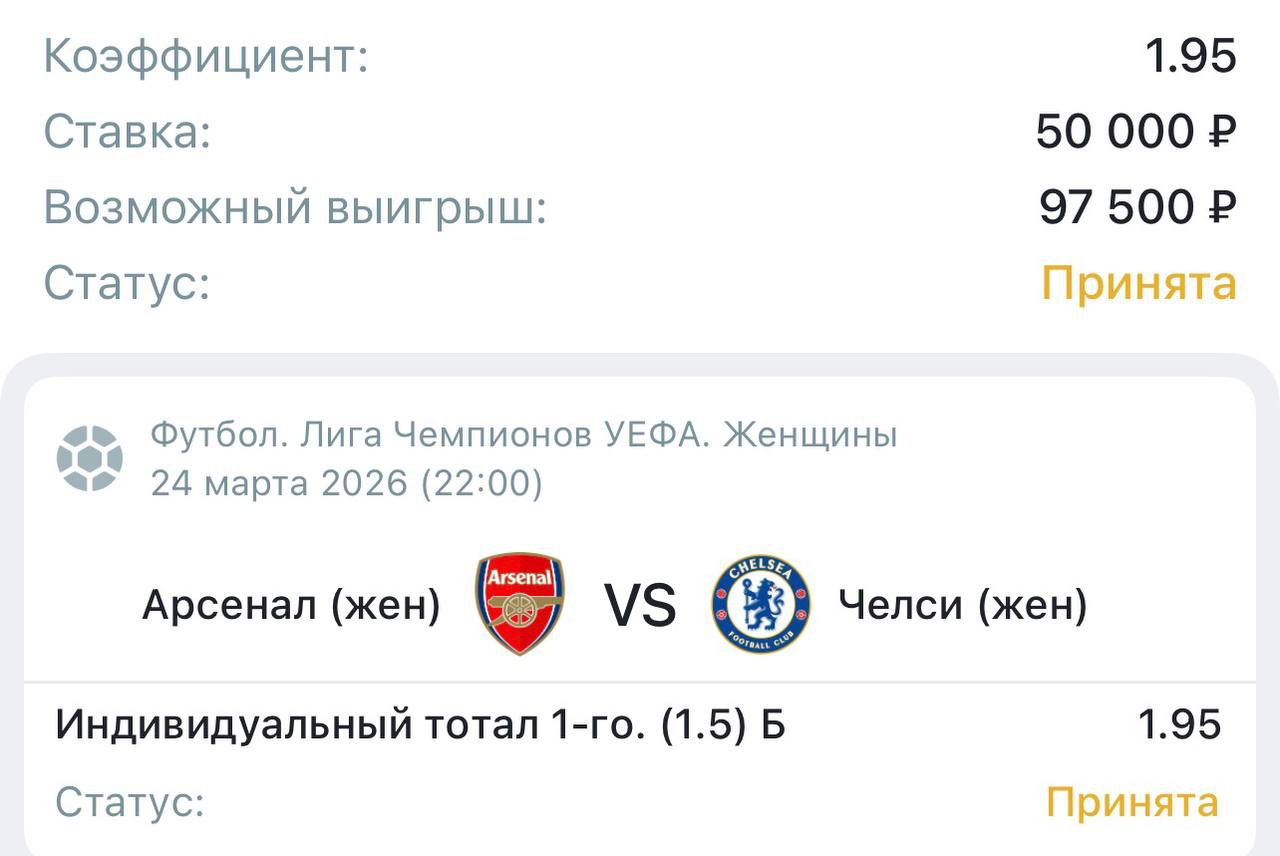 В этом матче вполне рабочим вариантом выглядит ставка на индивидуальный тотал первого больше (1.5). Хозяйки способны активно провести встречу впереди, навязать свой темп и создать достаточное количество моментов у чужих ворот. По такой игре Арсенал (жен) вполне может наиграть как минимум на два забитых мяча, если сумеет реализовать свои подходы в атаке.