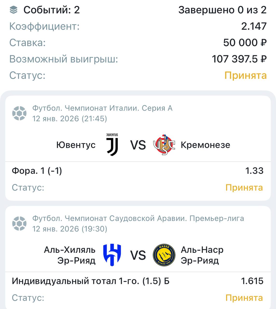 ​СТАВКА ДНЯ 🏆 ⚽️ Футбол | 🇮🇹 Италия — Серия A Ювентус 🆚 Кремонезе Старт: 12.01.2026 / 21:45 МСК 📊 Разбор матча: Ювентус дома традиционно действует с позиции силы и практически не оставляет пространства соперникам ниже классом. Команда уверенно контролирует…