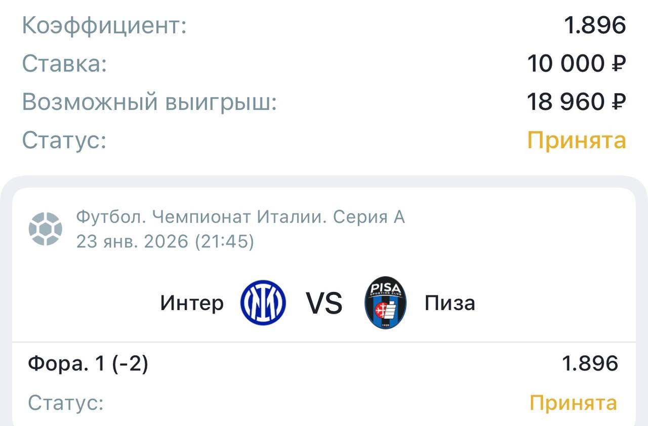 • Логика выбора форы (-2): В первом круге «Интер» спокойно победил на выезде со счетом 2:0. Ставка на (-2) на «Сан-Сиро» выглядит математически обоснованной: она дает страховку (возврат) при победе в два мяча и высокий коэффициент на сценарий разгрома, который логичен при такой разнице в классе.