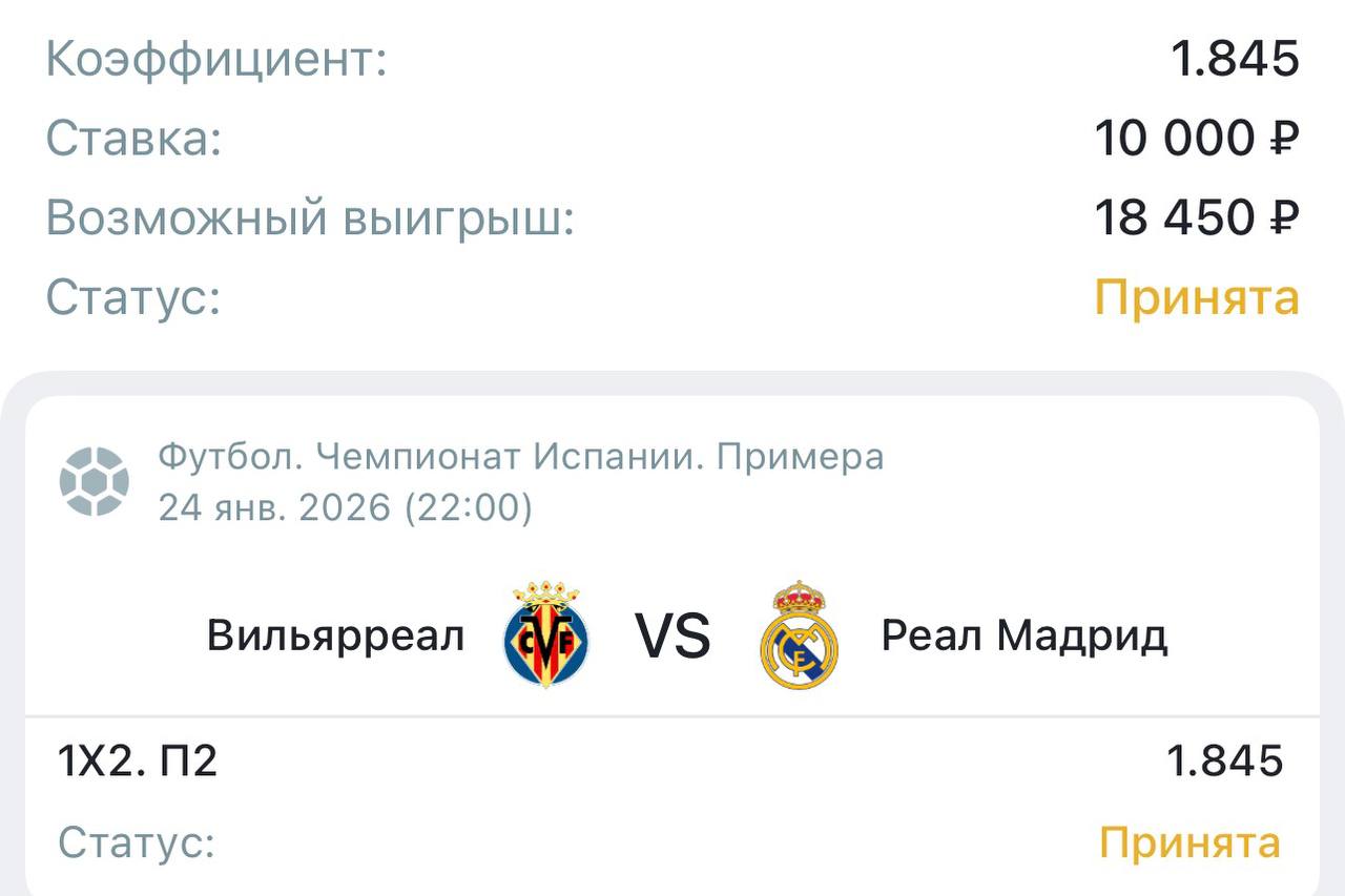 СТАВКА ДНЯ 🏆 ⚽️ Футбол | 🇪🇸 Ла Лига Вильярреал 🆚 Реал ⏲ Старт: 23:00 МСК 📊 Разбор матча: Прогноз П2 за 1.845 выглядит как «Логичная ставка на фаворита», но с заниженным коэффициентом. • Логика: Объективно «Реал» сильнее по составу и находится…