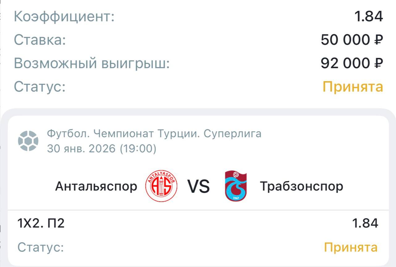 Сделка обоснована пересечением трех трендов: мотивация фаворита, историческое "клиентство" Антальяспора и отличная выездная модель игры Трабзонспора. Эмоции отключены, цифры подтверждают вход.