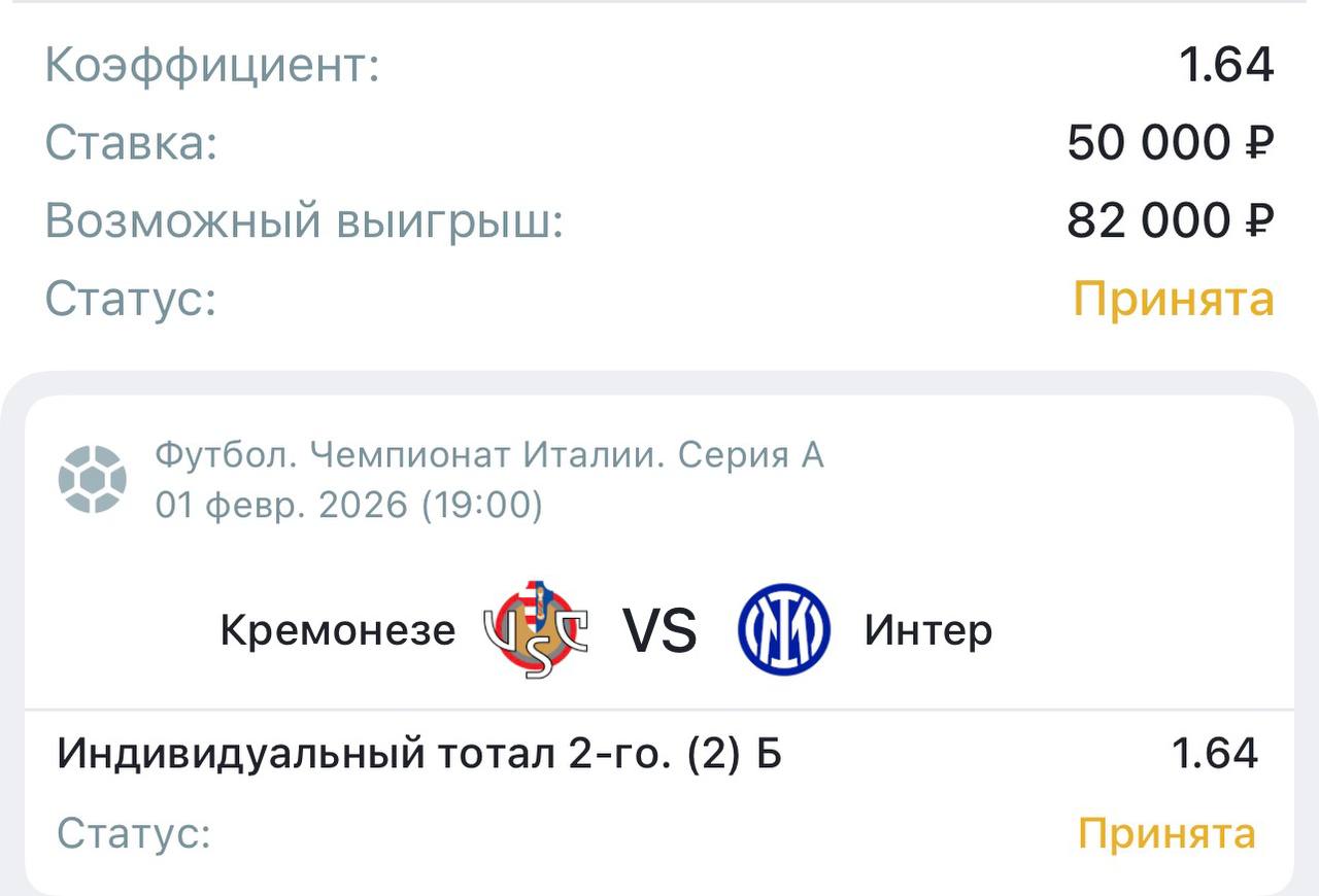 Сделка обоснована колоссальной разницей в классе и атакующей мощью миланцев. «Интер» традиционно лидирует по метрикам созданных моментов (xG), тогда как оборона «Кремонезе» системно проваливается в матчах против топ-клубов. Целочисленный тотал обеспечивает математическую страховку: возврат при двух забитых мячах и чистый профит при реализации атакующего потенциала фаворита.