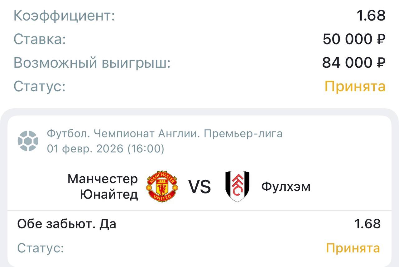 Сделка обоснована пересечением трех трендов: стабильная результативность хозяев (ОЗ зашла в 10 из 12 последних матчей МЮ), кризис в обороне «Юнайтед» (14-е место в лиге по пропущенным голам) и эффективность атаки Фулхэма, который забивал в 5 из 6 последних встреч. Эмоции отключены, цифры подтверждают вход.