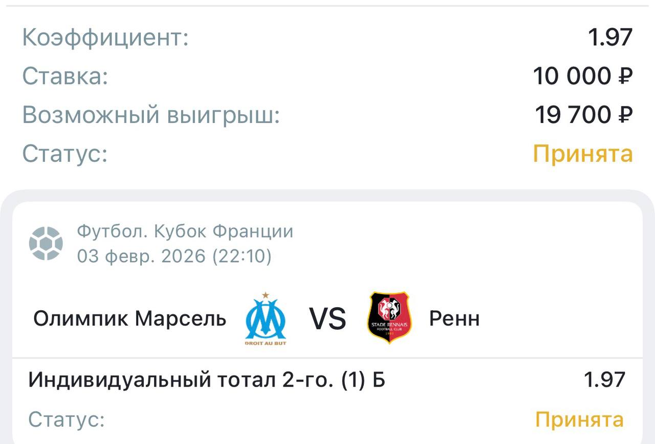 Выбор обоснован статистикой выездных моделей «Ренна» и спецификой кубковых матчей, где ротация часто открывает зоны в обороне. Гости обладают достаточным классом для реализации своих моментов (xG) против атакующего «Марселя». Целочисленный тотал обеспечивает математическую страховку: возврат при одном забитом мяче и чистый профит при реализации атакующего потенциала гостей.