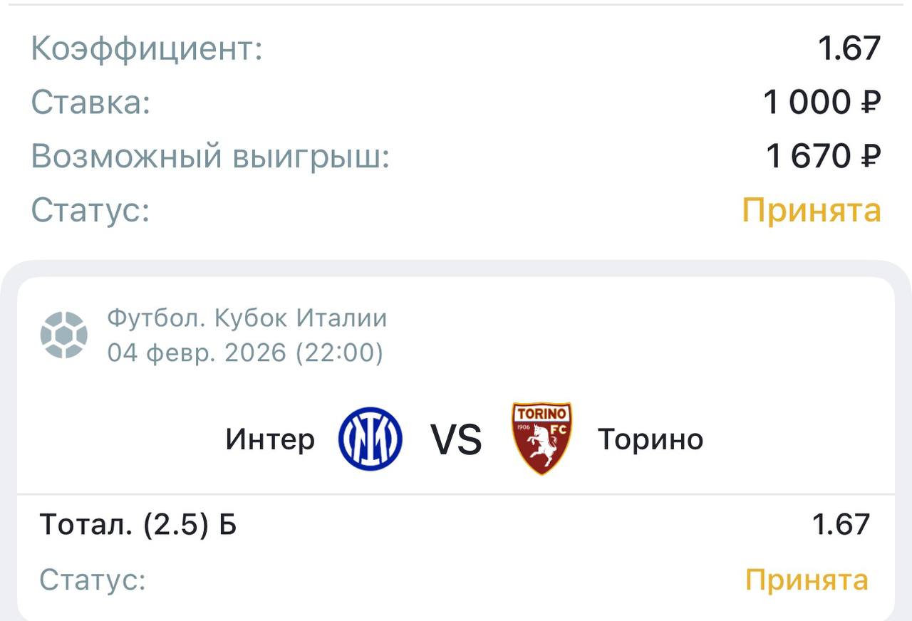 Я оставляю совсем мизерный шанс на то что Торино может ответить голом, хотя Интер и сам должен такой Тотал пробивать. Главное, чтобы не остановились после двух, как в прошлом матче, с ними такое бывает