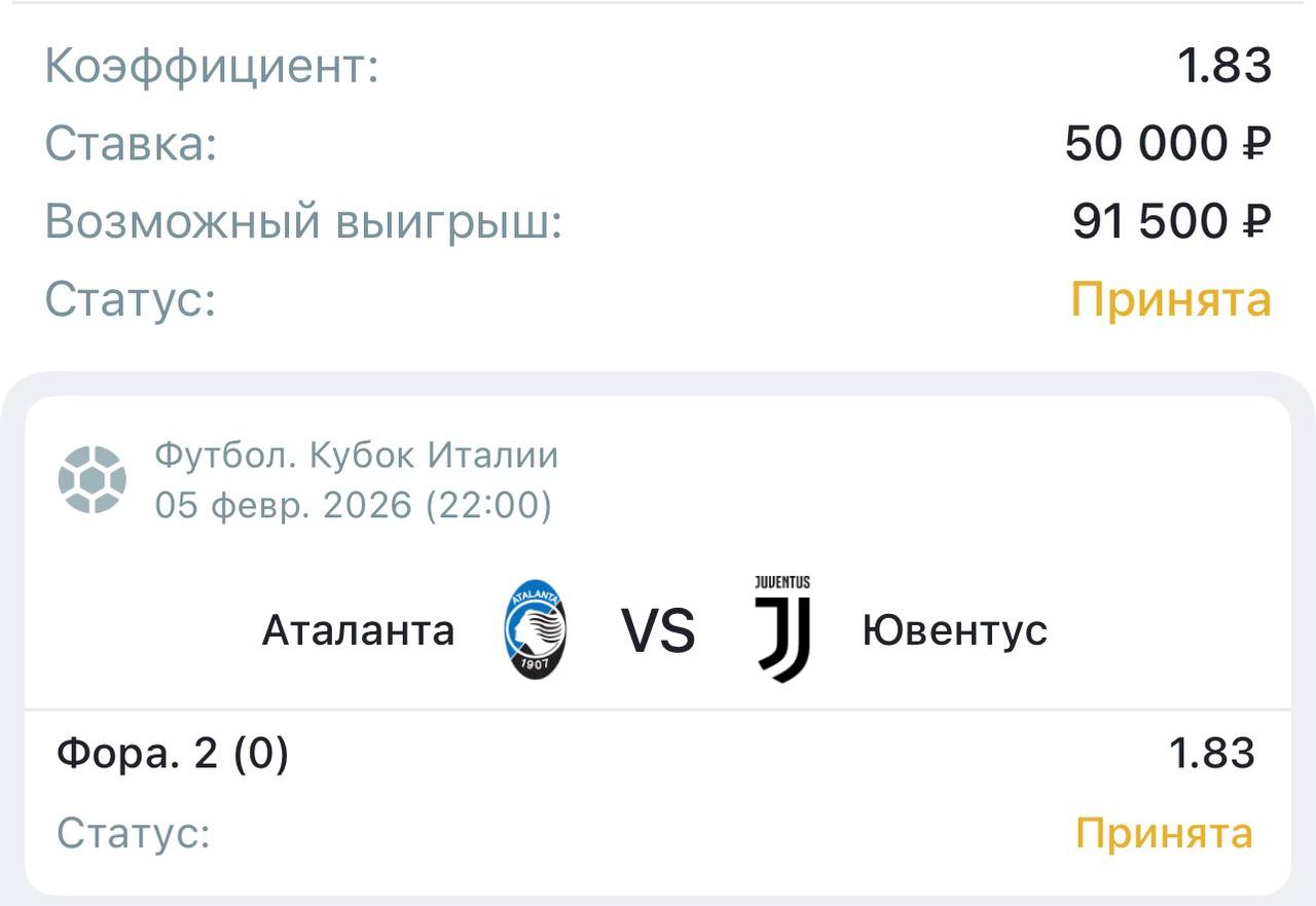 «Ювентус» — исторически самый успешный клуб в Кубке Италии. В матчах на вылет (одноматчевое противостояние) опыт и тактическая дисциплина, которую привил Спаллетти, часто важнее домашнего куража «Аталанты». Вспомним финал Кубка 2024 года, где именно «Ювентус» обыграл «Аталанту» (1:0) благодаря организованной обороне. Ну и Аталанта сейчас находится на спаде. Думаю, прогноз очень даже хороший