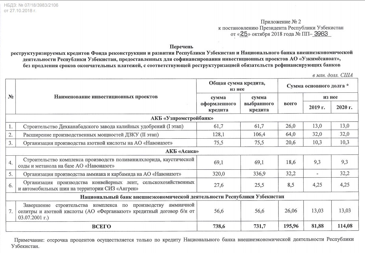Решением главы государства установлено, что АО «Узкимесаноат» и входящим в его структуру хозобществам на разработку ПД и выполнение изыскательных работ выделяются кредиты Фонда реконструкции и развития сроком на 5 лет (включая льготный период – 3 года), с процентной ставкой ❗️ 2,25% годовых, включая маржу рефинансирующего банка в размере 0,25% годовых в период до пуска инвестпроектов в эксплуатацию. При этом дано согласие на реструктуризацию обязательств АО «Узкимёсаноат» и предприятий, входящих в его структуру, по ранее выданным кредитам Фонда реконструкции и развития и Узнацбанка согласно приложению №2 к постановлению.