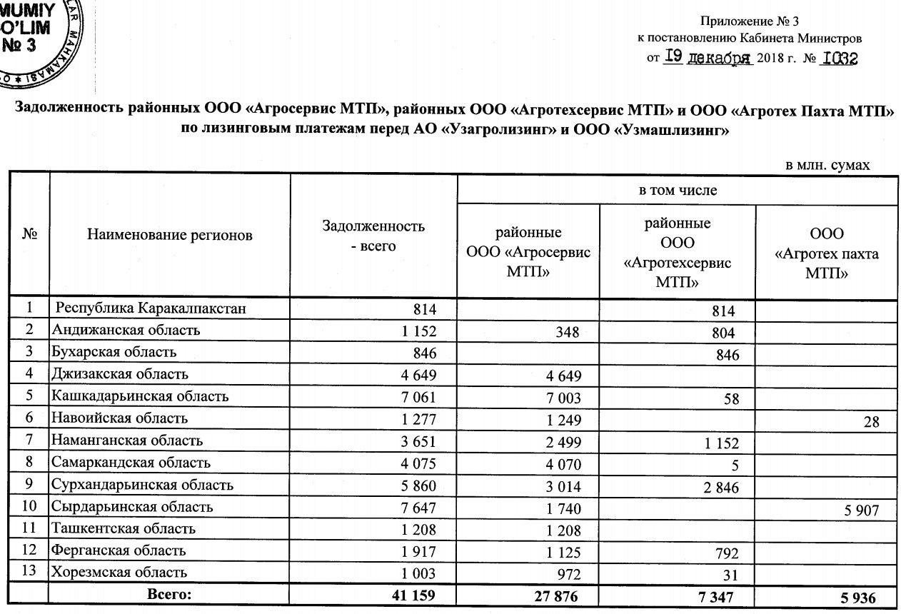41,15 млрд.сум) районных предприятий «Агросервис МТП» (27,87 млрд. сумов), «Агротехсервис МТП» (7,34 млрд.сумов) и «Агротех пахта МТП» (5,93 млрд. сумов) по лизинговым платежам перед АО «Узагролизинг» и ООО «Узмашлизинг».⬇️Скачать ПКМ№1032 в формате PDF
