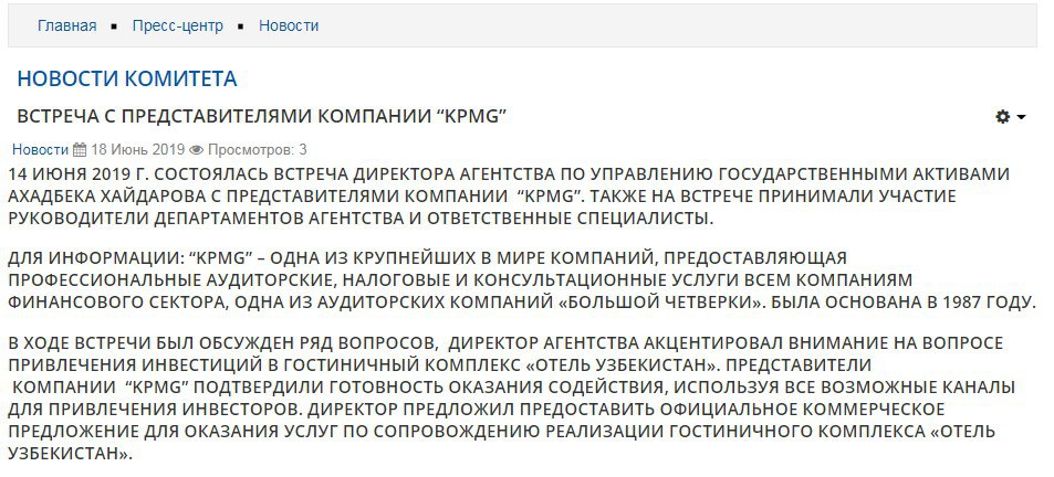 Как указано в пресс-релизе АУГА (правопреемник Госкомконкуренции в части управлению госимуществом), представители компании KPMG подтвердили готовность оказания содействия в привлечении инвестиций в гостиничный комплекс «Отель Узбекистан», используя все возможные каналы для привлечения инвесторов.