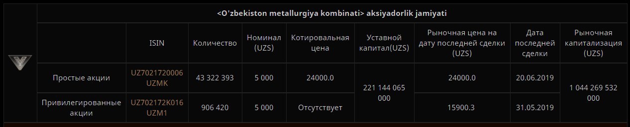 Акции предлагаются на продажу по цене 1450 сумов/шт при номинальной стоимости 1000 сумов/шт. При этом биржевых сделок с акциями АО не было со дня запуска нового торгового комплекса ЕПТК в августе 2016 года.