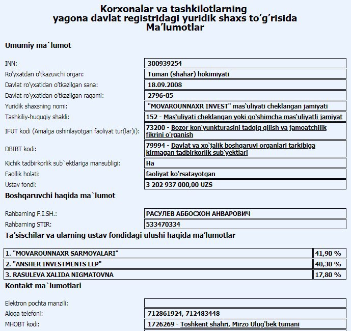 🏛 СП ООО «Movarounnaxr Invest» [