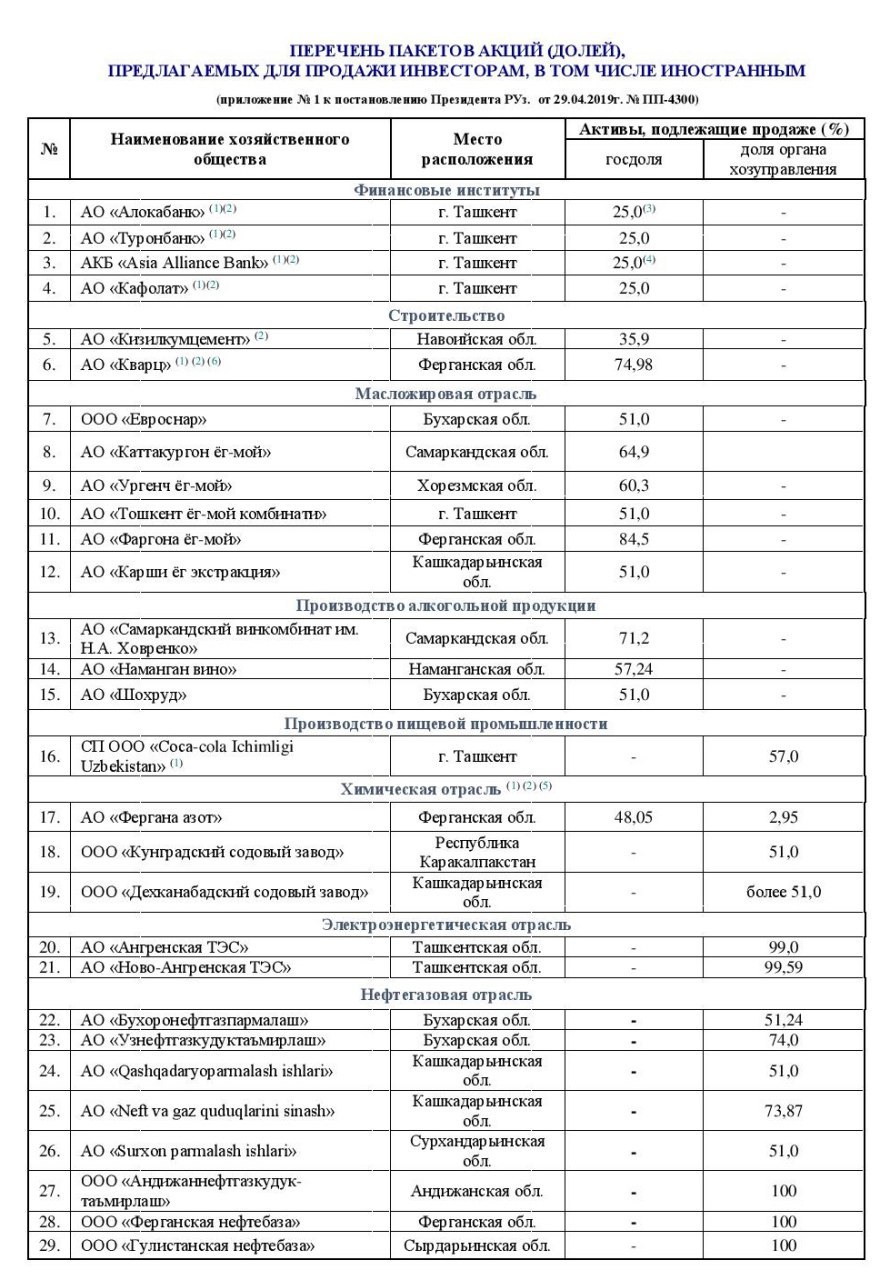 Примечания к утвержденному в апреле т.г. нижеприведенному перечню предприятий в которых доли государства и хозобъединений подлежат продаже