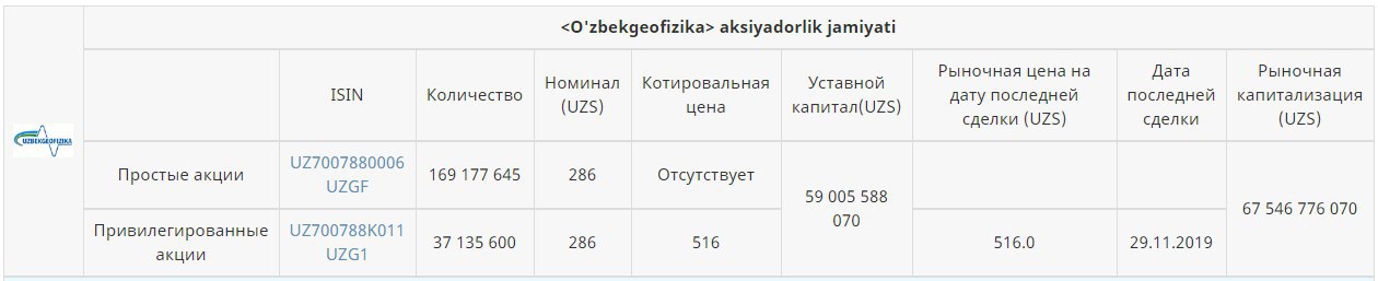 Начальная цена госпакета акций (290796 шт) равна 91,10 млрд. сум, что составляет 333 942,03 сум за одну простой акцию АО [GUEY] . При этом номинальная стоимость одной акции равна 1999 сум, а последняя (до делистинга) биржевая сделка с акциями прошла 25.12.2017г. по 28700 сум за акцию.