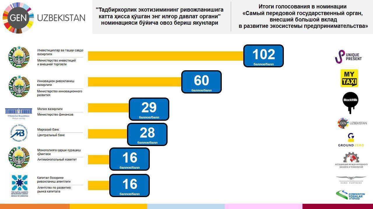 По результатам голосования в номинации Самый передовой госорган, внесший большой вклад в развитие экосистемы предпринимательства, первые три места заняли: