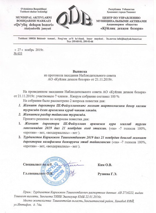 Соответствующее решение принято 21 ноября набсоветом АО «Куйлик дехкон бозори».