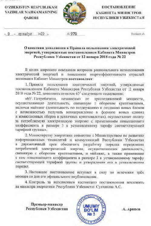 📜✍️ Вышеуказанное дополнение внесено постановлением КабМина от 09.12.2019г. №979, в котором Минэнерго поручено совместно с Мининфоком в двухмесячный срок обеспечить разработку порядка определения потребителей электроэнергии, осуществляющую деятельность, связанную с оборотом криптоактивов, и майнинг, а также применение к ним повышающего коэффициента в размере 3 к установленному тарифу соответствующей тарифной группы и утверждение его в установленном порядке.