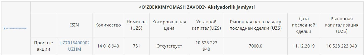 Напомним, что в ноябре т.г. ООО «РУЗ-Инвест» [Москва, РФ] стало владельцем 27% доли в уставном капитале АО «Завод Узбекхиммаш» .