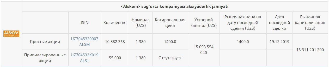 Акции компании [ALSM] предложены по цене 1685,93 сум за штуку при номинале 1380 сум и биржевой котировке 1445 сум. Стоимость пакета акций (доли) обходится в 2,99 млрд. сум.