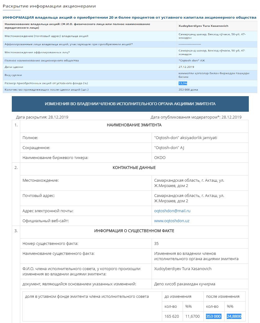 Согласно объявления на веб-сайте РФБ, внебиржевая сделка (сделки) по приобретению Т. Худойбердиевым акций АО «Oqtosh-don» прошла 27 декабря т.г. Объём приобретенных Т. Худойбердиевым акций составляет 13,3% от уставного капитала АО. После сделки ему принадлежит 353 000 шт. акций АО.