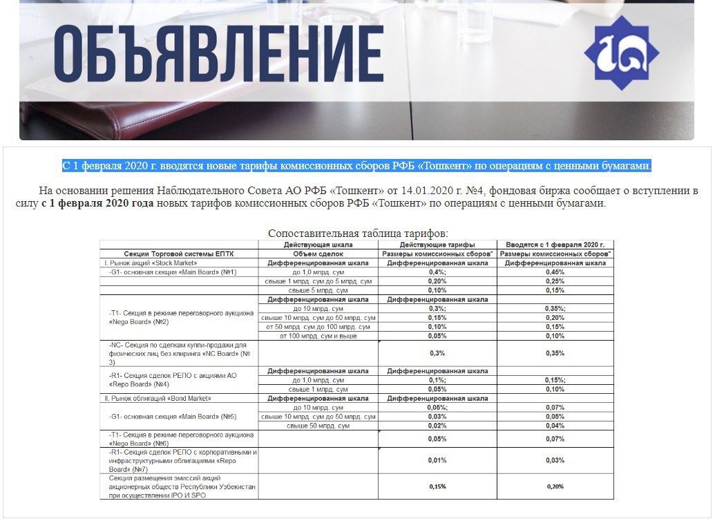 Как указано в объявлении единственной в республике фондовой биржи, на основании решения набсовета РФБ «Тошкент» от 14.01.2020 г. №4, с 1 февраля 2020 года вступают в силу новые тарифы комиссионных сборов по операциям с ценными бумагами на РФБ.