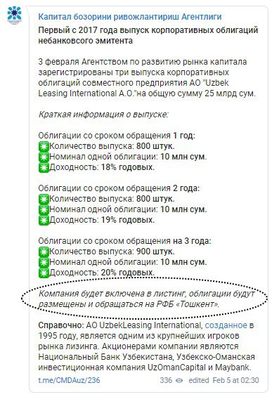 Исходя из сушфакта, опубликованного 03.02.2020г., на ВОСА от 05.02.2019г. было также принято решение о включении корпоративных облигаций АО «#UzbekLeasing International A.O.» в биржевой котировальный лист РФБ «Тошкент».