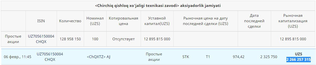 Цена одной акции АО «Чирчикский завод сельскохозяйственной техники» в сделке составила 974,42 сум при номинале 100 сум.