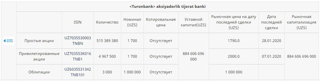 По данным из веб-сайта АКБ "Туронбанк" [TNBN, TNB1] на 01.01.2020г. крупными акционерами Банка являются: