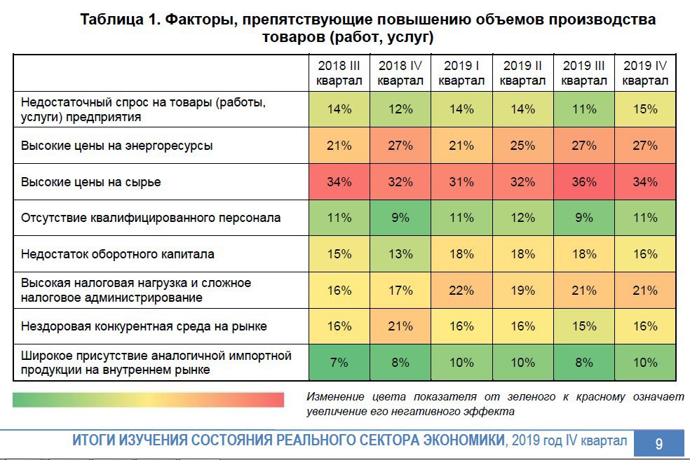 Согласно результатам изучения факторов, препятствующих росту объёма производства, сохраняется на высоком уровне доля респондентов, отметивших высокие цены на сырьё (34%) и источники энергии (27%), а также высокую налоговую нагрузку и сложное налоговое администрирование (21%) в качестве основного фактора, сдерживающего рост производства.