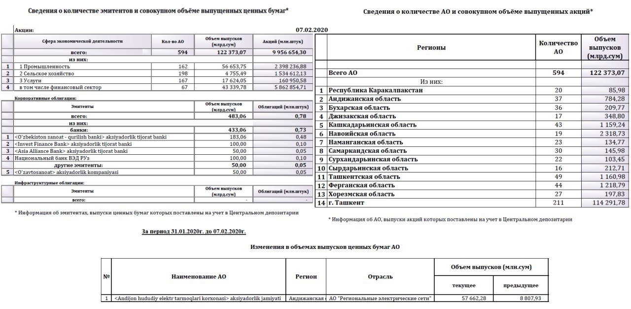 По состоянию на 07.02.2020г. объём акций 594 АО, находящихся в размещении и обращении, составляет 122,37 трлн. сумов. При этом в 256 АО имеется прямая госдоля в объёме свыше 100,7 трлн. сумов.