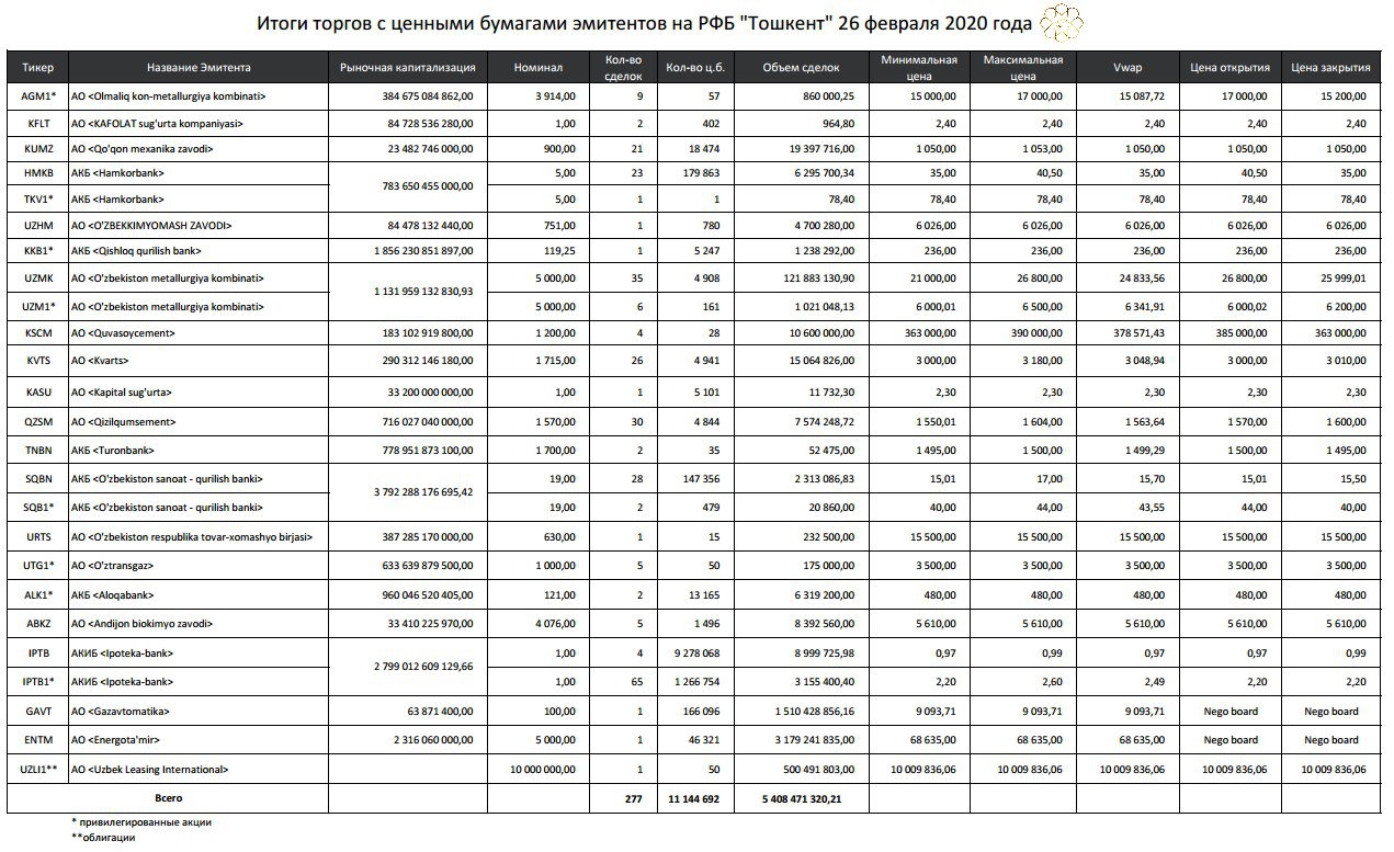 2 сделки купли-продажи были зарегистрированы организатором внебиржевых торгов (Элсис-савдо). Общая сумма сделок составила 112,93 млн. сумов. При этом цена одной акции в сделке равна 1716 сум.