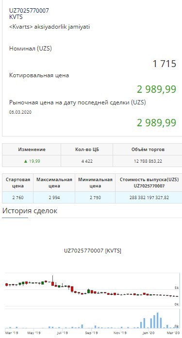 Цена на эти акции является крайне волатильной. По данным организатора внебиржевых торгов [Элсис-Савдо], за последние 30 дней минимальная цена на акцию составляла 2450 сум/шт, а максимальная - 18500 сум/шт.