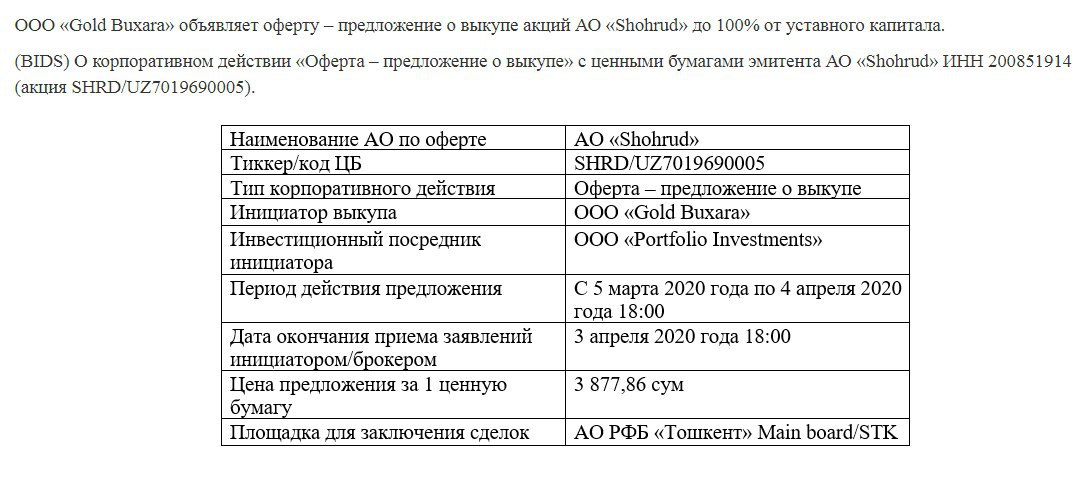 ООО «Gold Buxara» опубликовало объявление о намерении выкупить у акционеров АО «Шохруд» принадлежащие им простые акции по 3877,86 сум за штуку.
