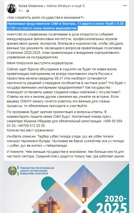 Возможный модератор мероприятия опубликовал на своей страничке в facebook информацию о том, что Агентство по управлению госактивами на 13 марта собирает международные финансовые институты, профессиональных игроков финансового рынка, экспертов, блогеров и журналистов на обсуждение трёх документов, касающихся вопросов приватизации госактивов, а именно стратегии на 2020-2025гг., плана приватизации и плана внедрения корпоративного управления на госпредприятиях [