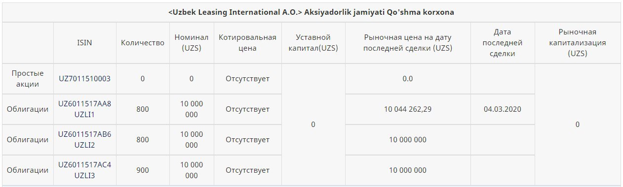 Напомним, что 3 февраля были зарегистрированы 3 выпуска корпоративных облигаций АО на общую сумму 25 млрд. сумов, размещение которых предусмотрено на фондовой бирже [UZLI1, UZLI2,UZLI3]. При этом по имеющейся информации данные облигации не обеспечены имуществом.