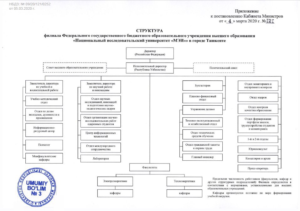 📜✍️ Постановлением КабМина от 04.03.2020г. №121 Министерству высшего и среднего специального образования, Минэнерго, а также Акционерным обществам «Тепловые электрические станции» [ТЭС], «Национальные электрические сети Узбекистана» [НЭС], «Региональные электрические сети» [РЭС] и «Узбекгидроэнерго» [УГЭ] поручено принять меры по завершению процесса укомплектования Филиала Российского Национального исследовательского университета «МЭИ» в Ташкенте высококвалифицированным профессорско-преподавательским составом.