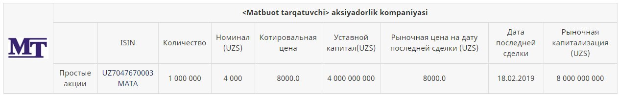 Примечательно, что делистинг (исключение из биржевого котировального листа) акций АО «Матбуот таркатувчи» был в марте 2019 года.
