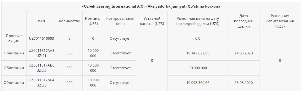 На внеочередном общем собрании акционеров АО «Uzbek Leasing International A.O.» [UZLI], состоявшемся 31 марта (кворум - 80,3%), предварительно утверждён заём СП ООО «Abu-Dhabi Uzbek Investment» (ADUI), предоставляемый Обществу на следующих первоначальных основных условиях: