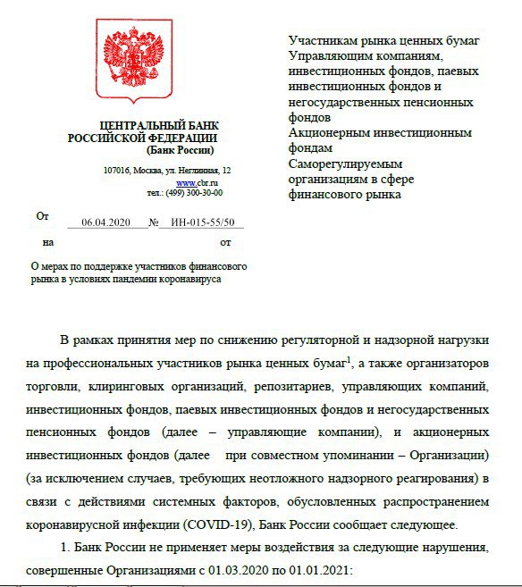 🏛 6 апреля Центробанк направил письмо всем участникам рынка ценных бумаг (РЦБ) , в связи с действиями системных факторов, обусловленных распространением коронавирусной инфекции (COVID-19).