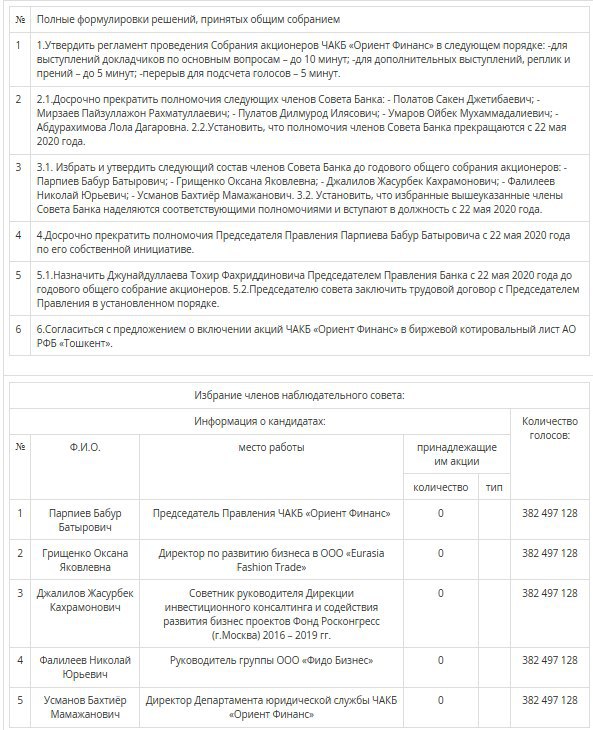 👤💼 С 22 мая прекращаются полномочия Парпиева Бабура Батыровича и Полатова Сакена Джетибаевича в качестве соответственно председателя правления и члена набсовета Ориент Финанс Банка